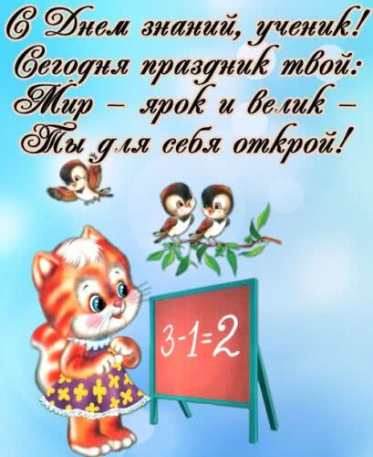 Поздравляю школьника с 1 сентября! Желаю успеха во всех предметах, спортивных достижений, побед в олимпиадах и конкурсах. Желаю полюбить учебу, узнавать много нового и полезного и радоваться каждому уроку.