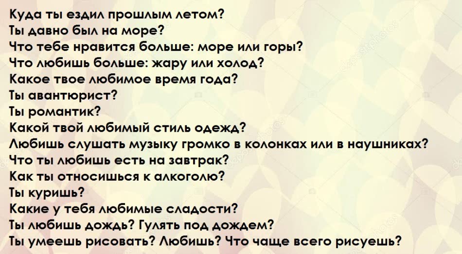 Переходим к вопросам, которые помогут достичь второй цели — интересно пообщаться. Данные вопросы можно использовать как в переписке, так и во время живой встречи.