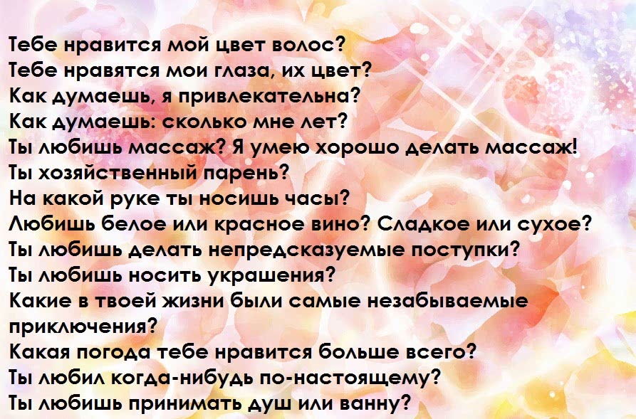 Такие вопросы помогают отвлечься и лучше узнать друг друга. Вообще, большинству мужчин нравятся девушки, которые любят, а самое главное умеют шутить.