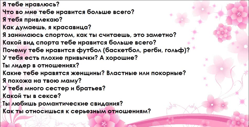 Пошлые обсуждения — провокация, так девушка намекает о намерениях, не говоря о них напрямую. Интерес к личной и интимной жизни мужчины воспринимают как открытый флирт. Пошлые вопросы парню про любовь раскрывают характер собеседника. Скромные мужчины не любят говорить на личные темы, они смущаются и зажимаются. Раскрепощенные, наоборот, активно поддерживают диалог и делятся жизненным опытом.