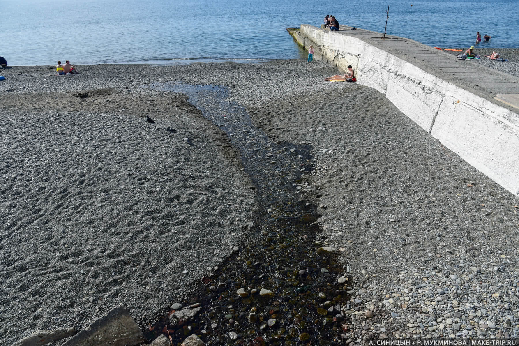 Мы прошли всю набережную в центре, подходили много раз к морю, и везде было довольно чисто. Ни вони, ни плавающих фекалий, только иногда среди гальки замечали окурки, фантики и природный мусор. Возможно, просто не дошли до тех мест, где пахнет… Я думаю, что многие туристы принимают ливневые стоки за канализационные. После дождей и при таянии снега в горах вода действительно бывает мутной.