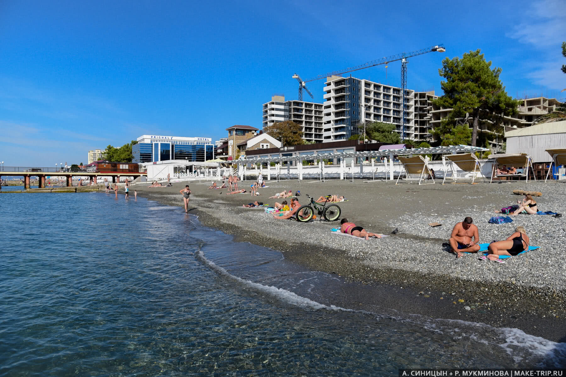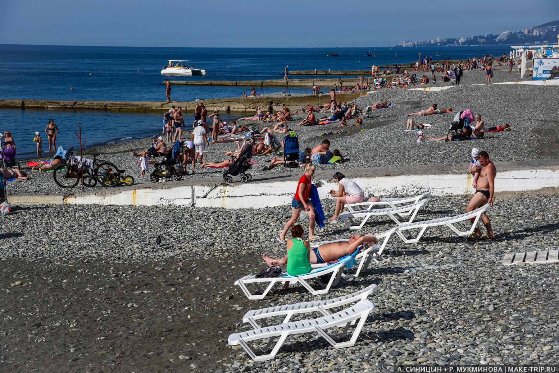 Даже в конце октября на пляжах Адлера отдыхает довольно много туристов.