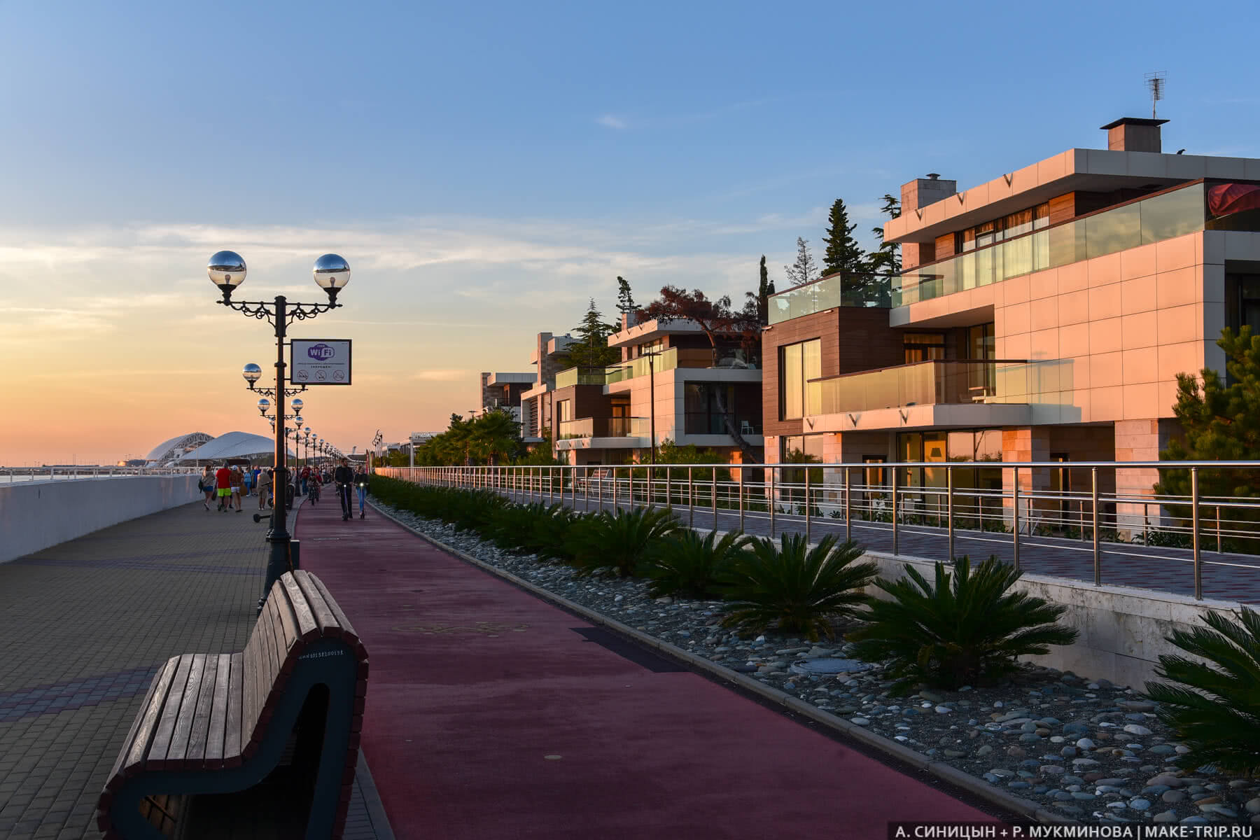 Так выглядит набережная в Имеретинской бухте. Справа — виллы парк-отеля «Арфа», вдали виднеется стадион Фишт.