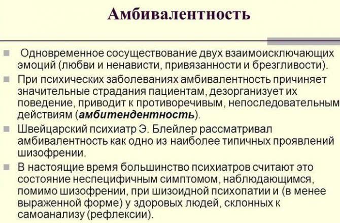 Понятие амбивалентность — это в психологии двойственное отношение к чему-то или к кому-то, два противоположных чувства. Человек или вещь становится причиной противоположных намерений, мыслей и эмоций у одной личности.