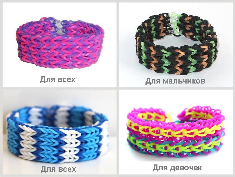 Среди десятков предложенных схем на разных сайтах следует уделить внимание самым простым и легким браслетам из резинок, ведь именно они так популярны среди начинающих вязальщиц в этом стиле. Сюда входит плетение браслетов на пальцах и работа с рогаткой