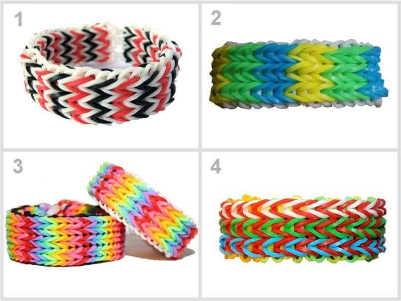 Теперь рассмотрим выбор цветных колечек на четырех примерах. В первом случае использованы резиночки трех контрастных цветов, последовательно следующих друг за другом. В результате изделие хорошо читается и выглядит интересно, несмотря на скудность красок.