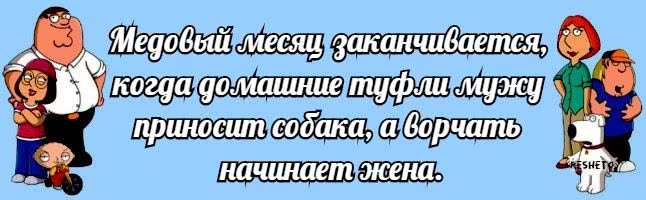 - Медовый месяц заканчивается, когда домашние туфли мужу приносит собака, а ворчать начинает жена.