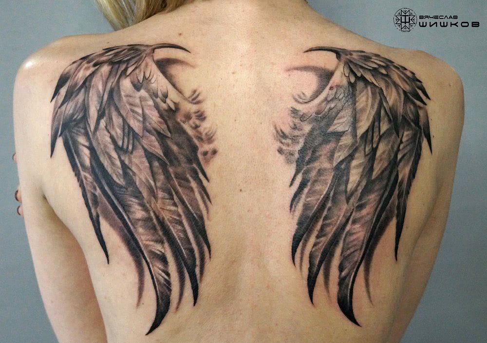 Также пользуются популярностью крылья в стиле блэкворк, акварель или минимализм, что особенно характерно для миниатюрных тату в области шеи, щиколотки или запястья.