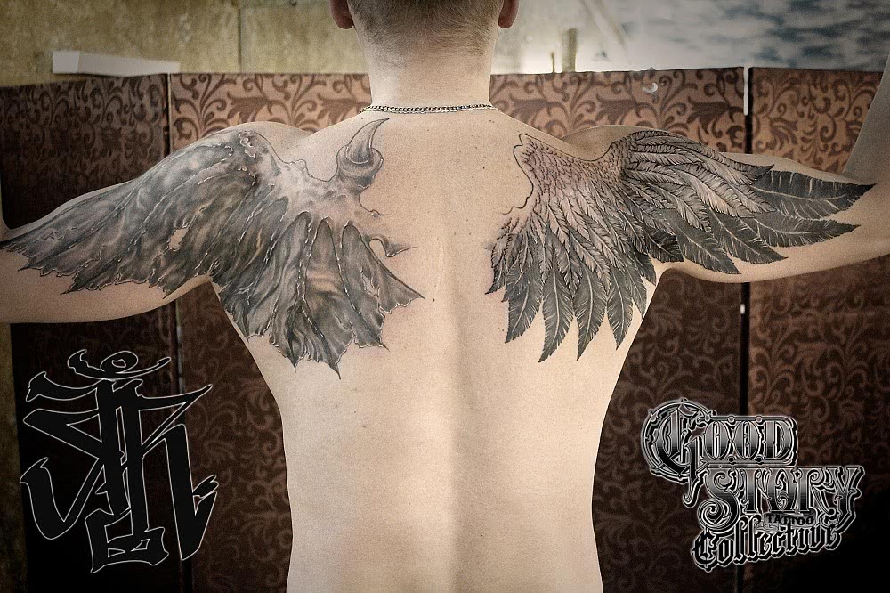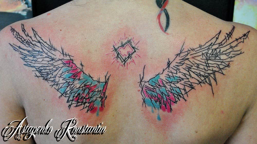 Изображение ангельских крыльев не всегда связано с религией, ведь каждый из нас одновременно не может быть человеком и принадлежать к свите ангелов. В большинстве примеров, крылья ангела наносят на теле в память о близком человеке, который покинул мир живых. Помимо этого, такой эскиз указывает на стремление вознестись нам мирскими заботами и суетой. Рисунок с ангельскими крыльями на женском теле указывает на её красоту, непорочность и чистоту помыслов. Подобное изображение на мужском теле говорит о доброте души своего хозяина. Не редко такой вид крыльев дополняется в татуировке нимбом, надписями с именами или инициалами, сердцем или цветами.