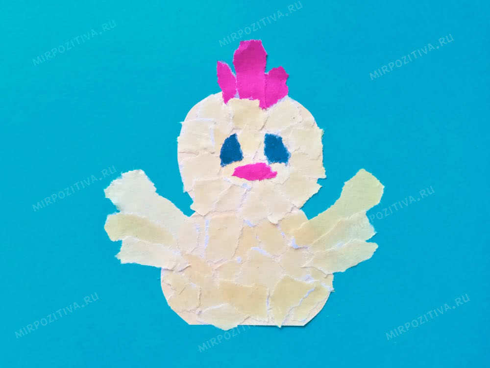 Детям раннего возраста, посещающим ясли, рваная техника дается непросто, поэтому достаточно будет, если они оформят гребешок красного цвета и грудку.