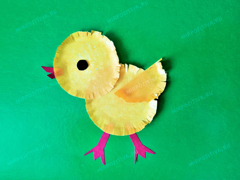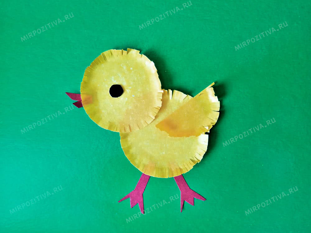 - Возьмите черную и красную цветную бумагу и сделайте из них глазки и клюв цыпленка;