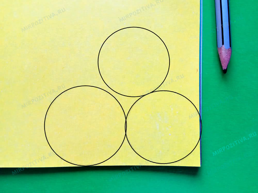 Шаг 1. Возьмите карандаш и жёлтую цветную бумагу. Используя подручный материал, например, крышку от молочной бутылки, сделайте три круга.