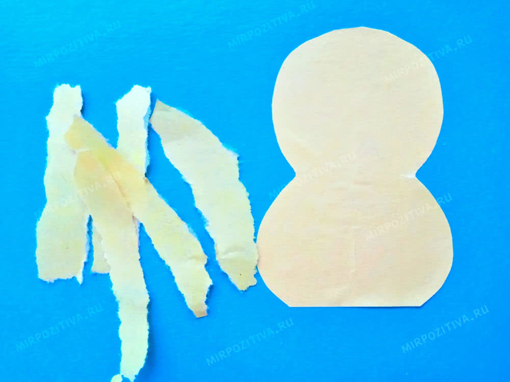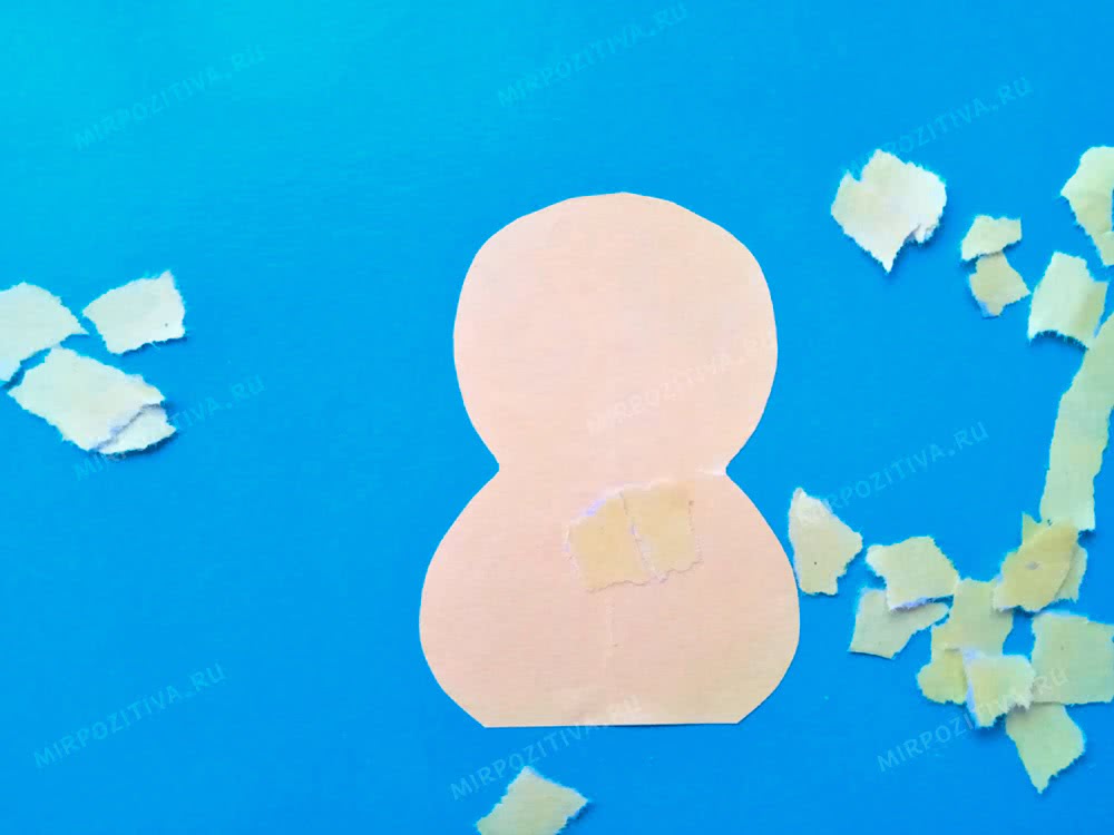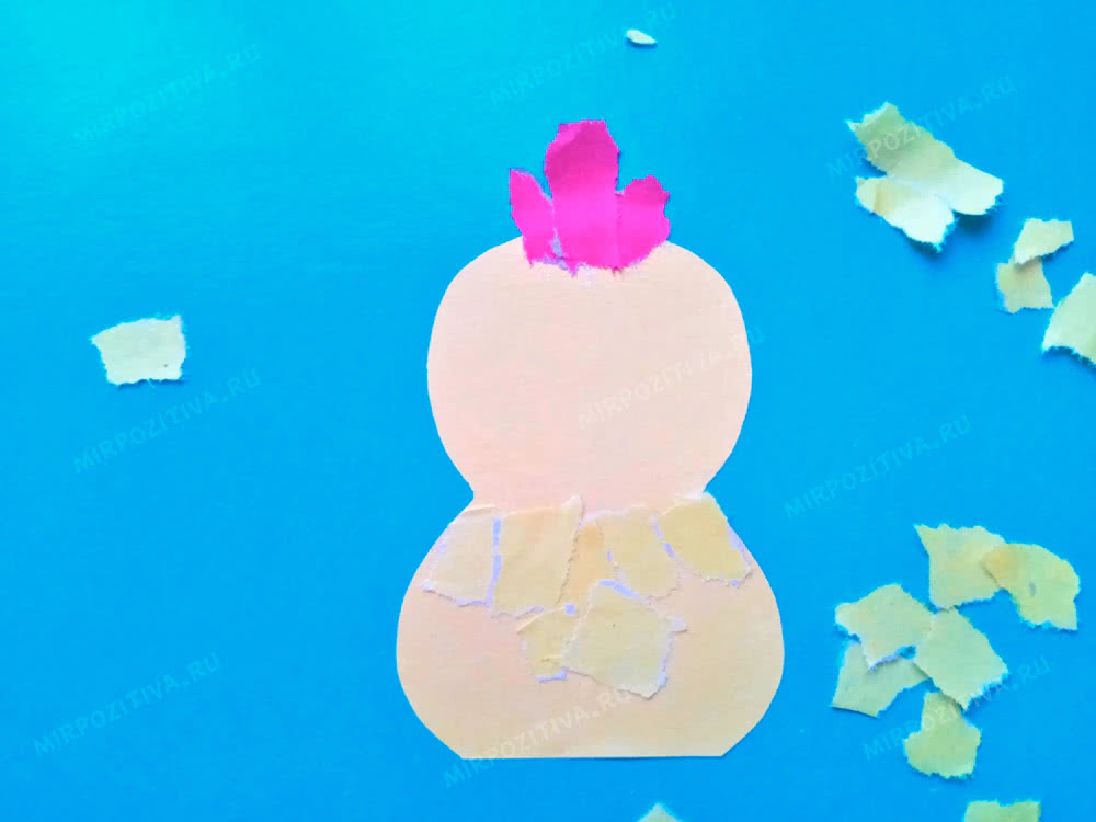 Полученные полоски порвите на мелкие элементы так, как показано на фотографии. Можно придумать и свой способ обрывания бумаги. Начинайте поэтапно приклеивать мелкие детали к полученному силуэту.