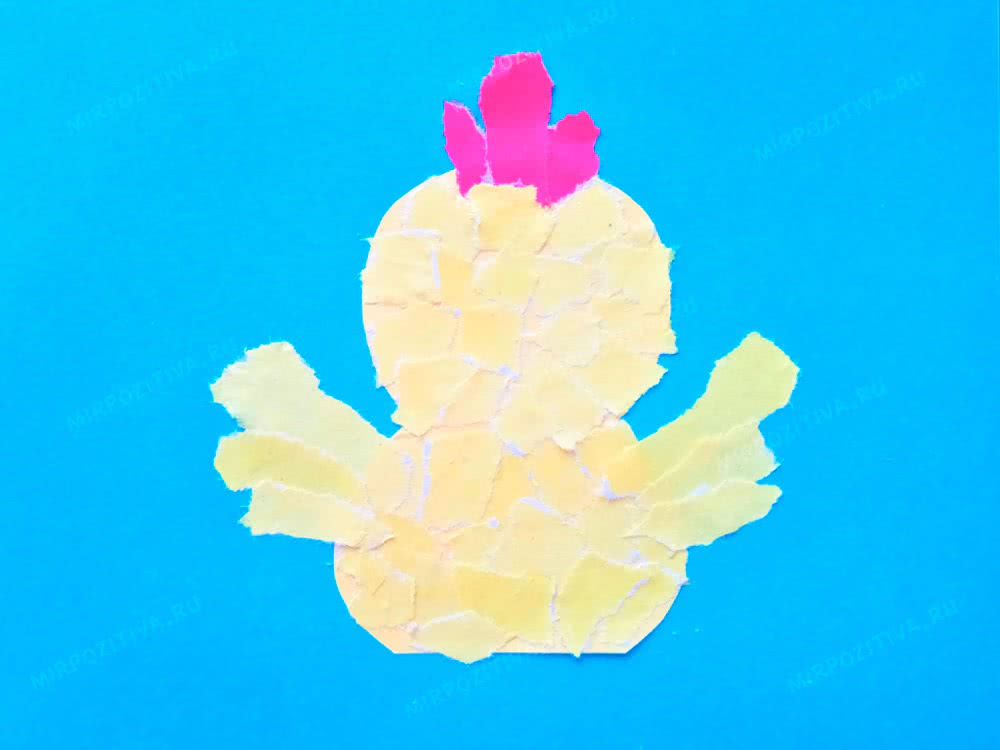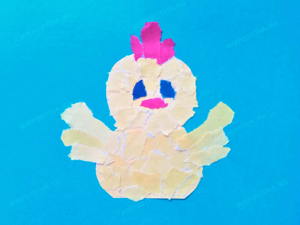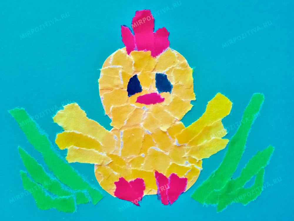 Этот пошаговый мастер-класс — для детей любого возраста. Обрывная аппликация для детей младшей группы отличается тем, что воспитанники частично обклеивают заранее приготовленные детали. Дети в средней группе заполняют обрывками только фигуру цыпленка. Для старшей группы задание немного усложняют: им нужно дополнить композицию.