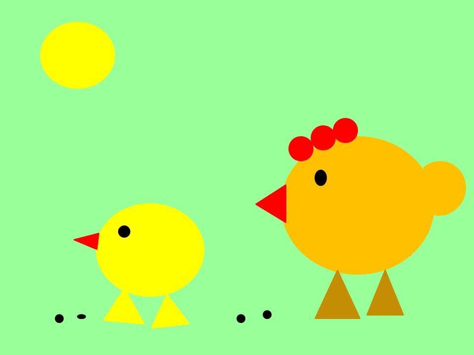 Воспитатель:Сегодня мы с вами сделаем цыплят для нашей курочки из цветной бумаги. Ребята, опишите цыплёнка, воспитатель показывает иллюстрацию картинку цыпленка.С помощью воспитателя дети составляют словесное описание цыплёнка: жёлтый, голова-маленький кружок, туловище — большой кружок, клюв-красный маленький треугольник, глаз — маленький черный кружочек.