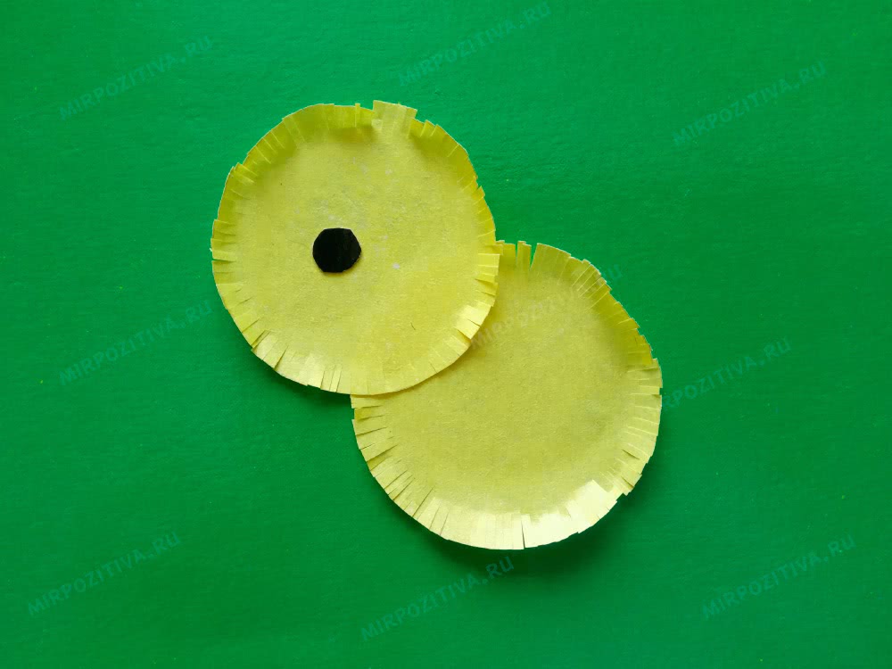 Шаг 5. Приклейте кружочки на листе бумаги или картона так, чтобы один немного заходил на другой. На верхнем кружке закрепите глаз.