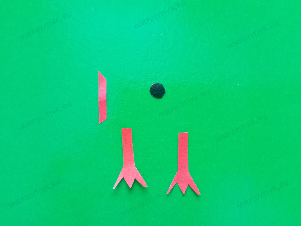 Шаг 4. Лапки цыпленка можно сделать по образцу, представленному ниже, или вырезать два небольших треугольника. Необходимо вырезать глаз — маленький черный кружок и клюв (тонкую полоску красного цвета).