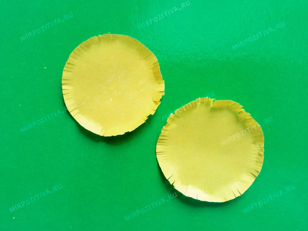 Шаг 3. Оформите таким же образом второй кружок. Дополнительно сделайте третью заготовку, для крылышка, разрезав пополам третий круг. На всех заготовках аккуратно отожмите пальцами бахрому, чтобы заготовка казалась пушистой.