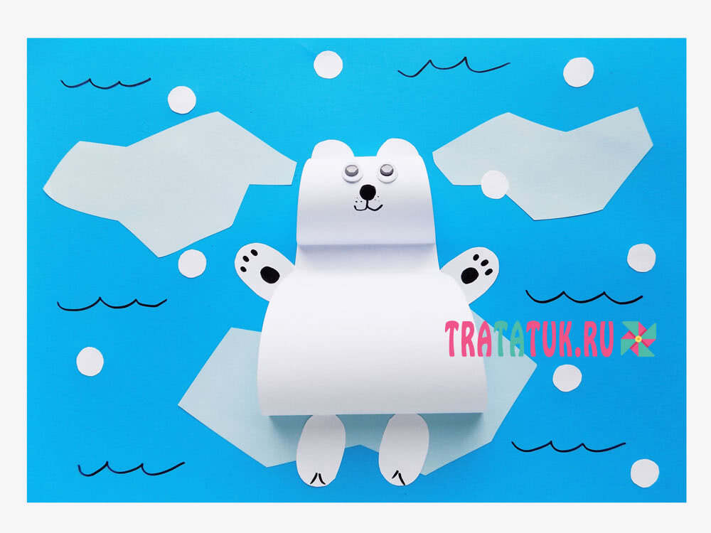 В этом мастер-классе представлена простая объемная аппликация «Медведь на льдине», выполнена из бумаги и картона голубого и белого цвета.