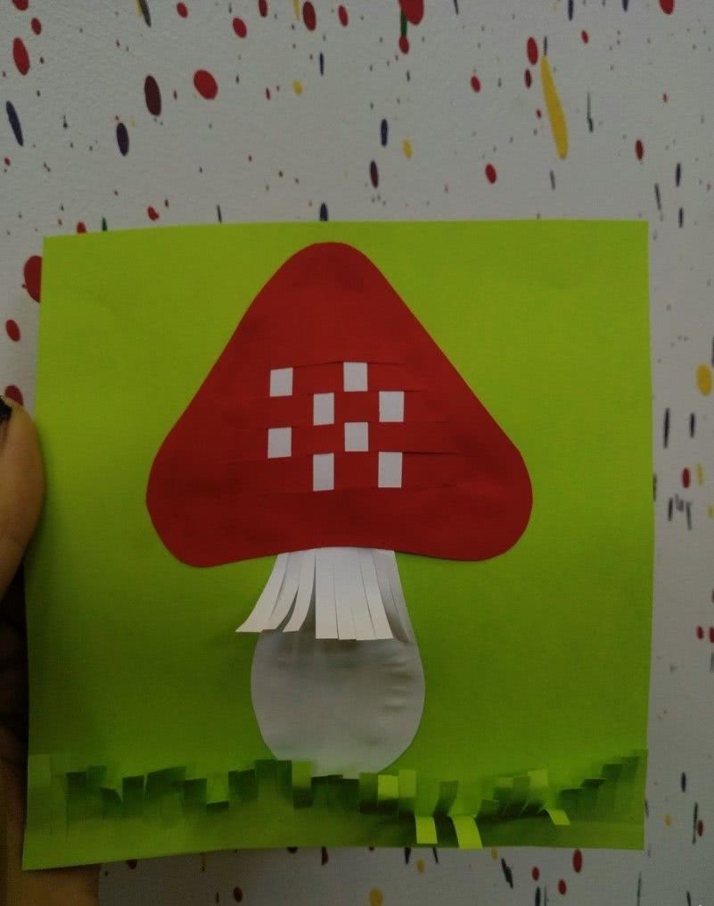 Если гриб выполняется в более сложной технике, шляпка должна быть отклонена, ножка входит в белую часть верхушки. Готовый белый гриб должен выглядеть так, как на фото аппликации из бумаги.