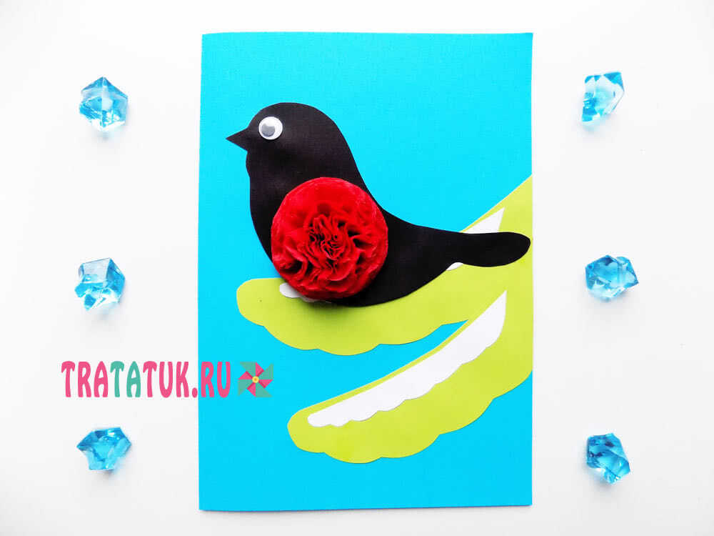 Работу над этой поделкой можно начать с загадки. Пусть ребенок попробует отгадать птичку, у которой грудка ярче, чем заря. Именно по ярко-красной грудке мы узнаем снегирей. В сегодняшнем мастер-классе у нас аппликация «Снегирь на ветке».
