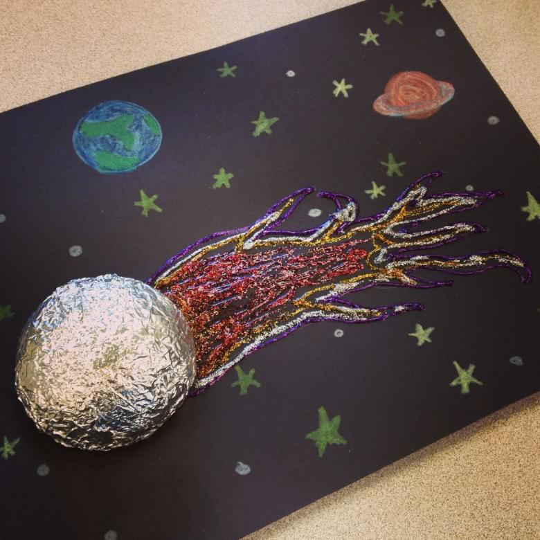 На картоне рисуется силуэт звёзд, ракеты или НЛО, любого другого объекта, которому посвящена картина. Она может обладать сюжетом или только украшать. Канадский художник Кэлвин Николлс однажды решил создавать из бумаги не только картины, а и восхитительные скульптуры. Стоит рискнуть, попытаться вместе с ребёнком изготовить аналогичный шедевр, посвятить работу теме бескрайних просторов Млечного Пути и соседних галактик.