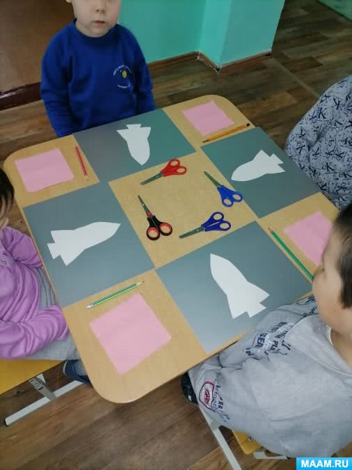 Конечно, мы сможем это сделать на ракете. Но для этого нам нужно ее смастерить. И сегодня мы с вами будем вырезать вот такие ракеты (показываю готовую ракету) Все, что нужно для работы, у вас на столах.