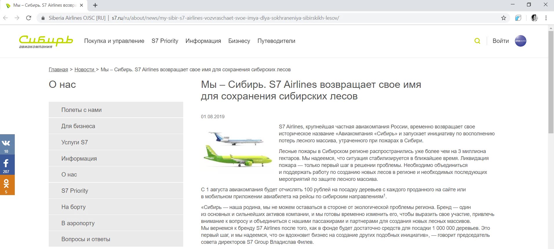 1 августа 2019 года авиакомпания S7 Airlines выразила свою позицию относительно ситуации с сибирскими лесами — вернула прежнее имя «Сибирь»