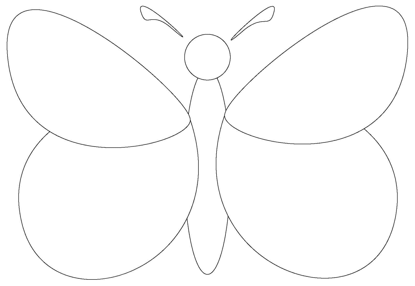 Наиболее простая схема, идеально подходящая для маленьких детей, не требует особой детализации. На листе бумаги тонко карандашом проводится горизонтальная линия: это вспомогательная ось, которая впоследствии сотрется. На ней, по середине, располагается овал таким образом, чтобы данной линией он делился на 2 части: верхняя в 2 раза больше нижней. Боковые части горизонтальной оси должны быть равны той, что заключена в овал. Теперь от нижней его области, из середины, выводятся чуть вытянутые в диагональ полукруги и соединяются с горизонтальной линией. Их величина равна 3-м нижним частям овала. Верхние зоны крыльев рисуются так же, но полукружья не вытягиваются, и по длине они незначительно выходят за незримую верхнюю грань овала.
