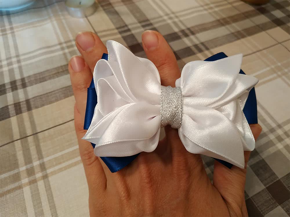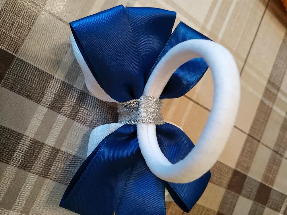 Оборачиваем бантик с резинкой по центру серебристой ленточкой, скрывая швы: