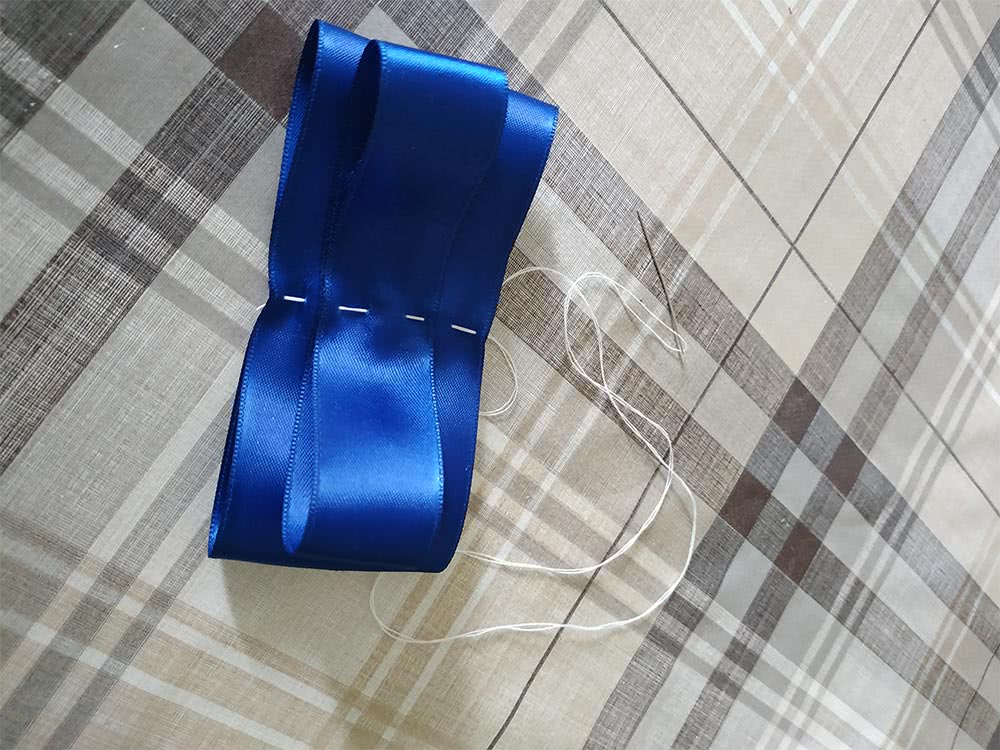 - Ленту присобрать на прочную нитку, пропуская ее по краю или центральной линии тканевой полоски.