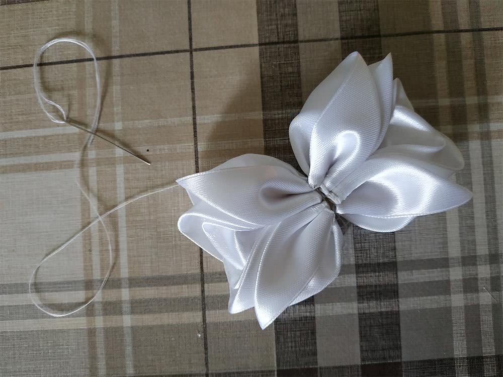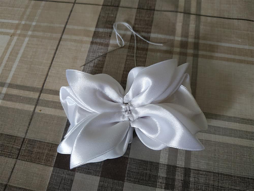 Самым сложным исполнением бантов из атласных лент является канзаши. Они представляют собой многослойные цветки с треугольными лепестками. В интернете на тематических сайтах в изобилии опубликованы фото канзаши и мастер классов, по которым можно вдохновиться на собственную поделку.