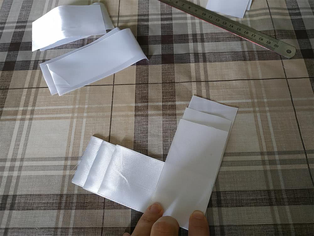 - Завернуть ее на вторую часть ленты, переводя из горизонтального положения в вертикальное. Прогладить утюгом, чтобы зафиксировать сгибы.