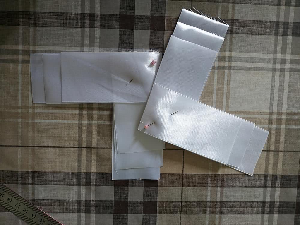 Сложив каждый отрезок пополам, намечаем серединку и разворачиваем. Складываем краешки отрезка к серединке с нахлёстом в несколько миллиметров. Фиксируем булавочкой.