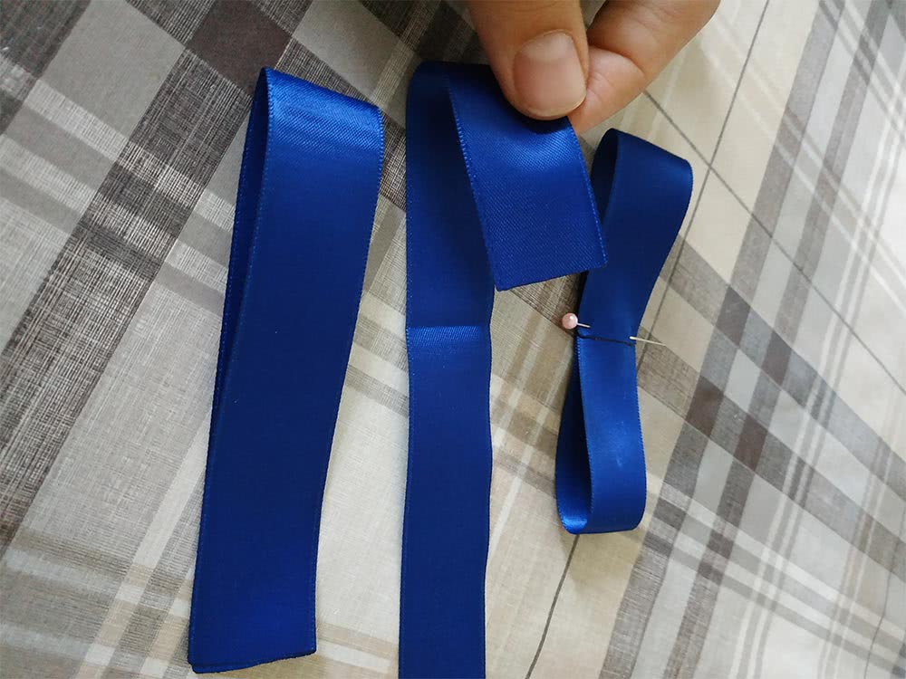 Можно сложить ленту втрое, чтобы получилось 3 одинаковых отрезка, а затем верхний край слегка вытянуть вправо.