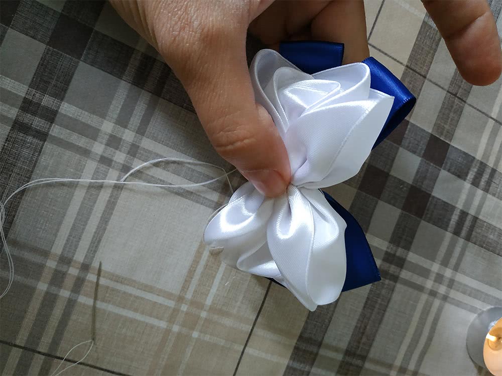 Теперь нам нужно красиво прикрепить бантик к резиночке. Для этого берём сдвоенную нить и с помощью иглы закрепляем бантик на верхней части резиночки, сшивая и приматывая к ней.