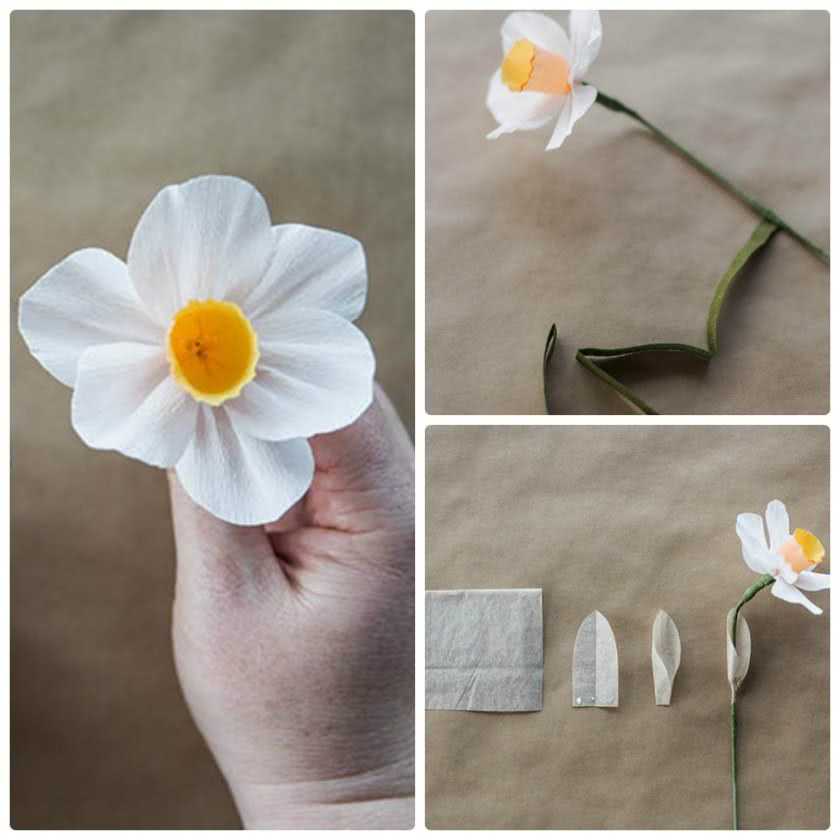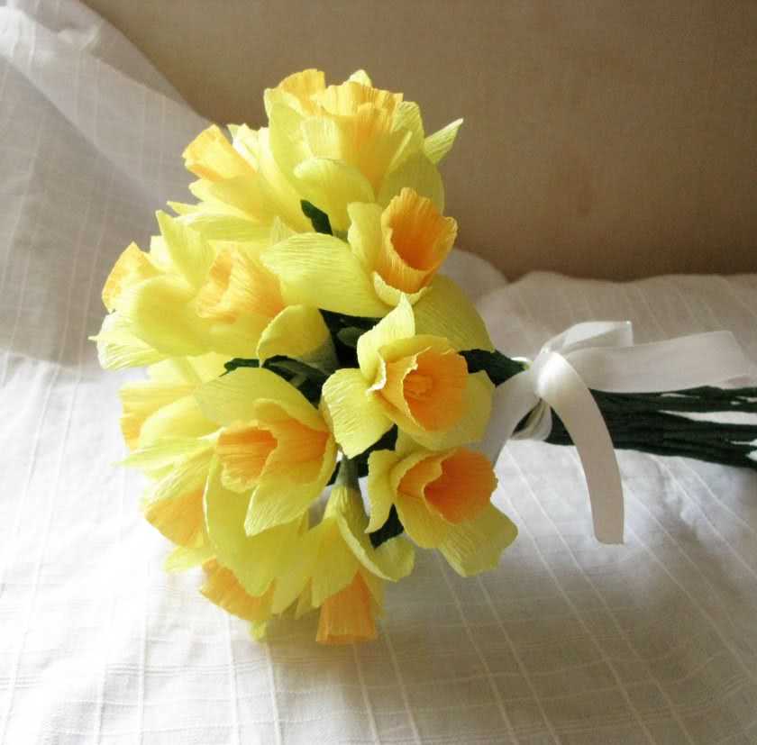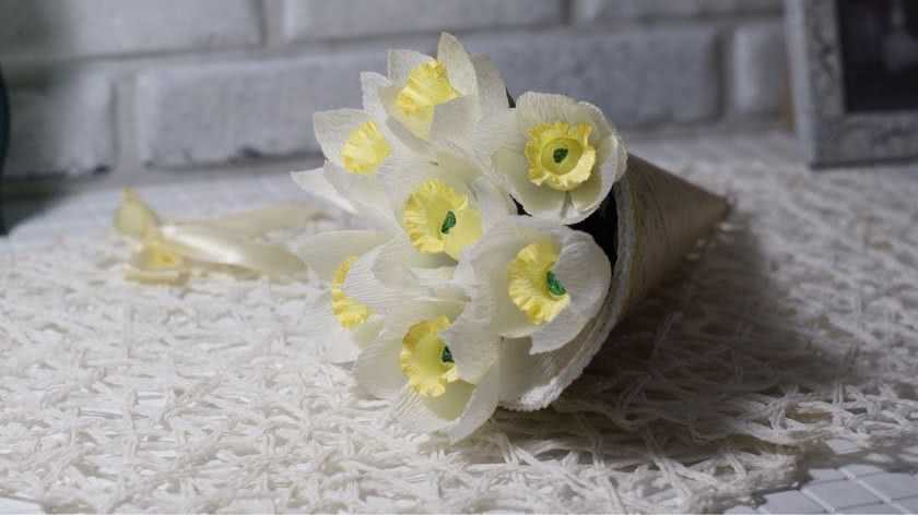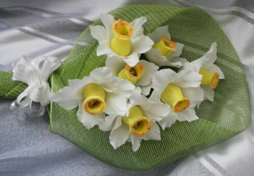 Внимательный просмотр уроков рукоделия, позволит увереннее обращаться с исходным материалом и в дальнейшем приступать к самостоятельному изготовлению более сложных поделок. Рассмотрим пошаговую инструкцию изготовления поделки нарциссов из цветной креповой бумаги своими руками.