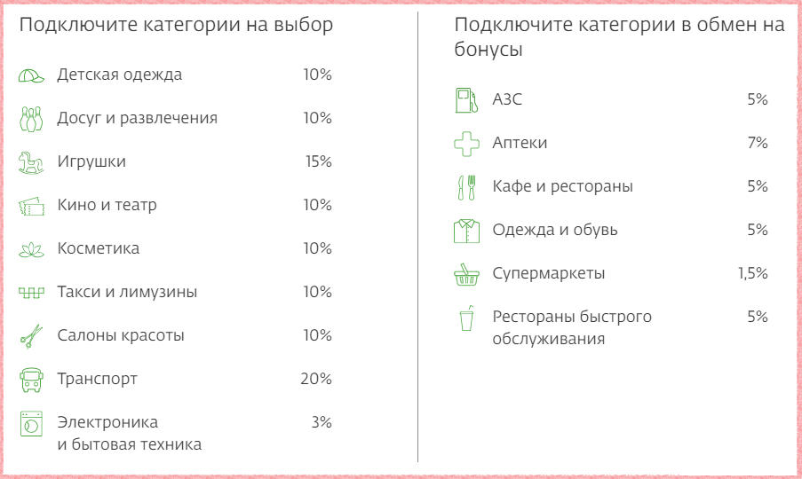 Здесь ко всем перечисленным выше привилегиям добавляются 4 категориии с повышенными бонусами, бонусы можно конвертировать в рубли.