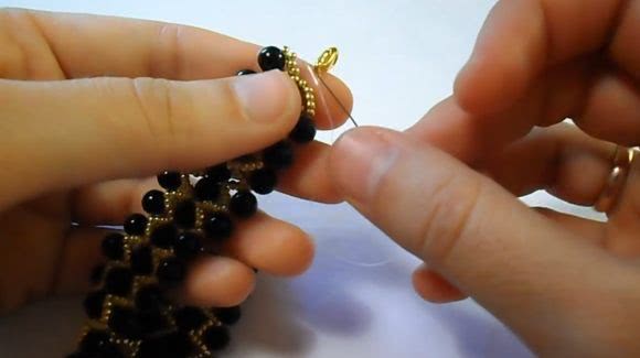Продолжаем и следим за нитью. Если кончик нитки при бисероплетении останется примерно около пятнадцати сантиметров, тогда понадобится нарастить нить. Необходимо сделать узелок и спрятать нитку в основу, сделав последний крепкий узел и нить обрезаем.