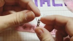 Пример — на фото: выводим иглу из № 1, нанизываем темную № 2, и вводим иглу в такую же № 2 предыдущего ряда.