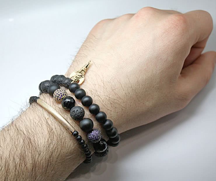 После того, как вы сплетёте пять-шесть обычных узелков, можно начинать вплетать бусины или камни. Предположим, что вы плетёте мужской браслет из черных бусин – берёте бусину и нанизываете её на центральный шнур. После этого вяжете обычный узел, оплетая бусину. Между ними лучше делать «пробелы» в виде трёх-четырёх узелков.