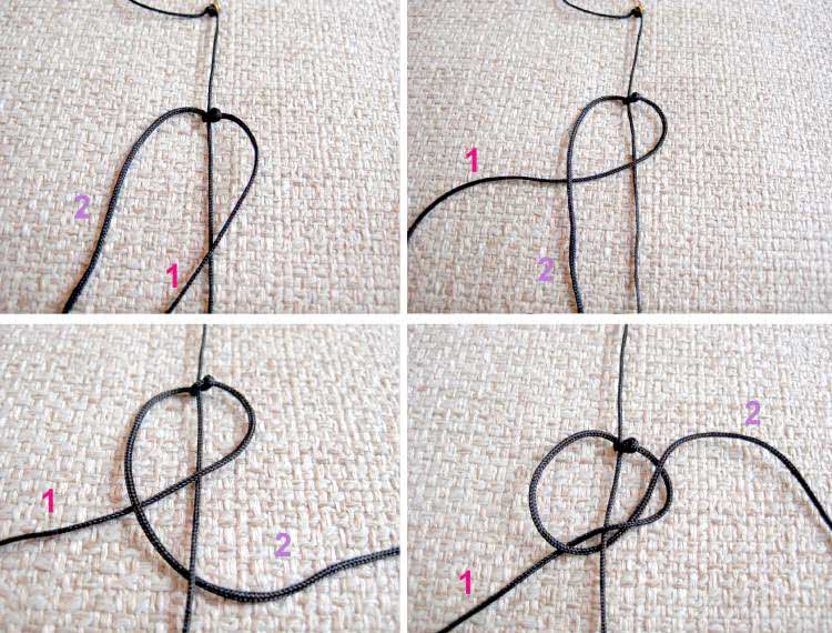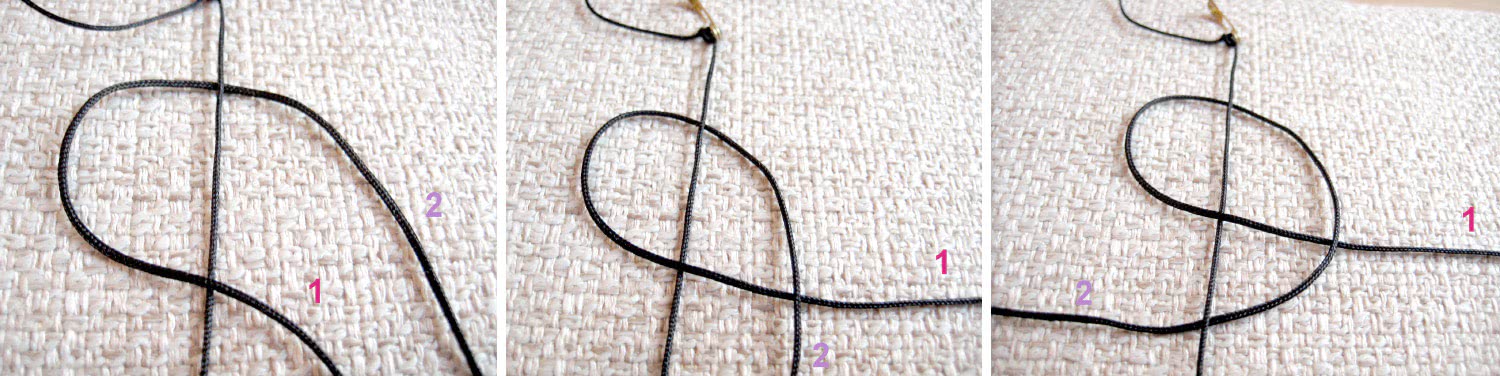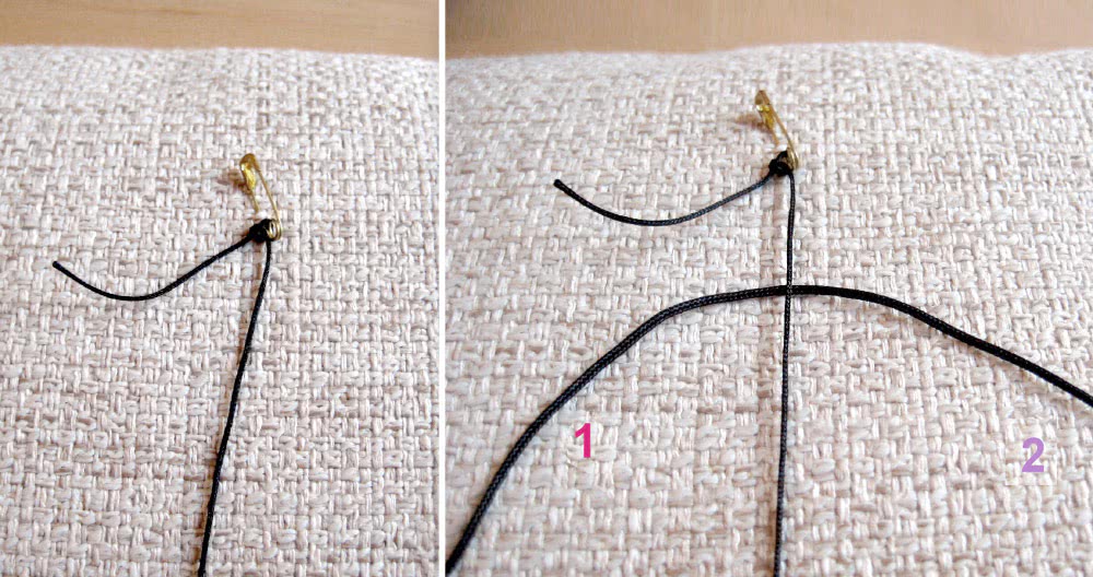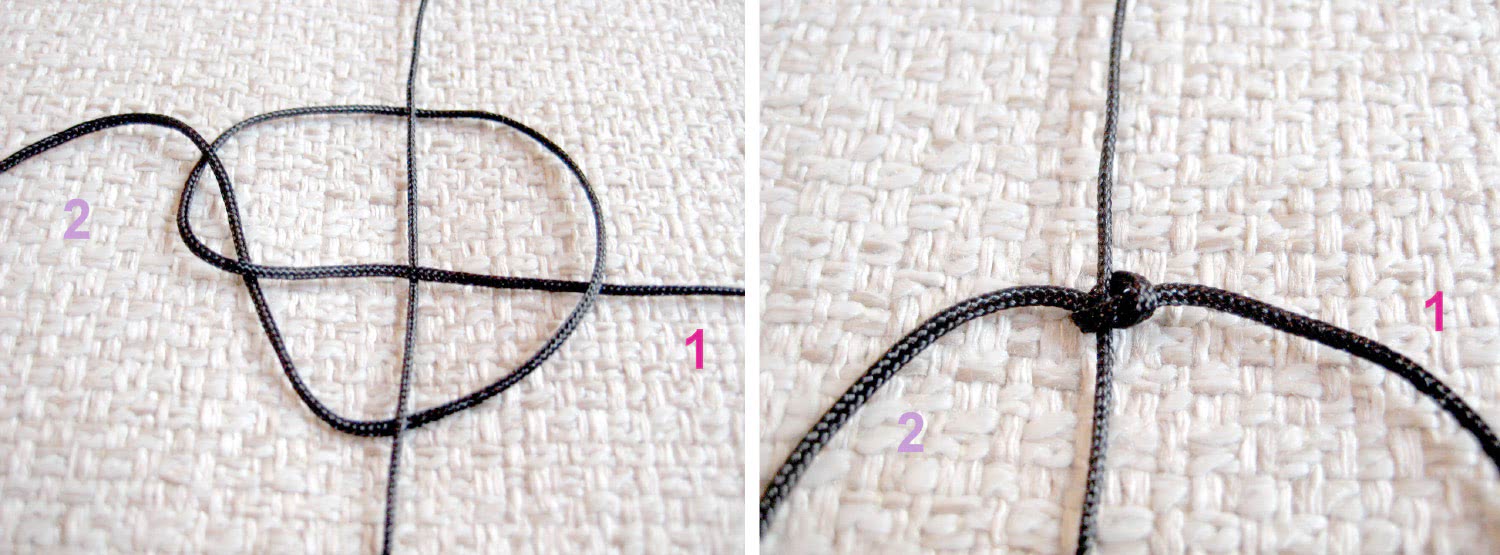 - 3 шнура одного или разных цветов скрепляют слабым узелком. Кладут левый — на центральный, а правый шнур размещают на левом, но протягивают под центральным, чтобы при затягивании нитей получился узелок.