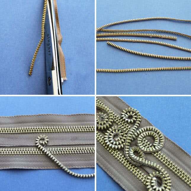 Обрезаем лишнюю ткань с трех молний и разъединяем их. Выкладываем молнии в виде узора и фиксируем горячим клеем. С помощью зубочистки убираем остатки клея.