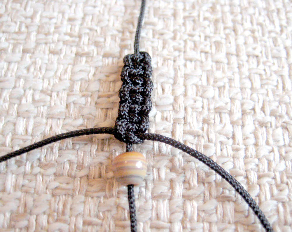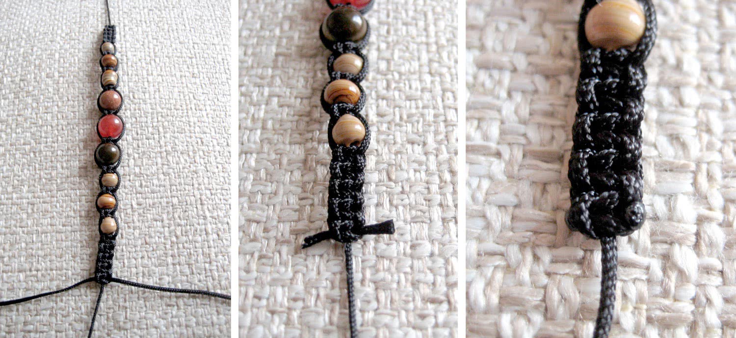 - На любом из шагов на центральную нить нанизывают бусину из камня или эпоксидной смолы, а боковые нити затягивают таким же узлом, как и предыдущие. Снова выполняют узелковое плетение до следующей бусины или камешка. Количество бусин зависит от желания.