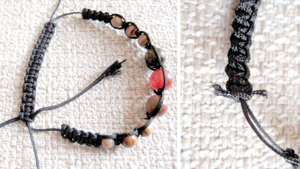 Когда завяжете финальный узел на браслете, обрежьте концы, оставив по 5 мм. Затем спрячьте их в соседние бусинки.