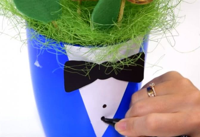 Из черного фетра или бумаги вырежьте бантик, приклейте, дорисуйте маркером пуговицы.