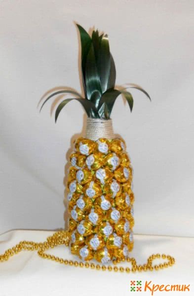 Приклейте бутылку. Разместите сделанные конфетные цветы по пустому пространству.