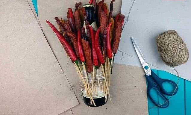 Вставляя шпажки в пенопласт распределите бутылочки, устанавливая ряд за рядом. Последний ряд должен быть самым высоким. Упакуйте в крафт или гофро бумагу.
