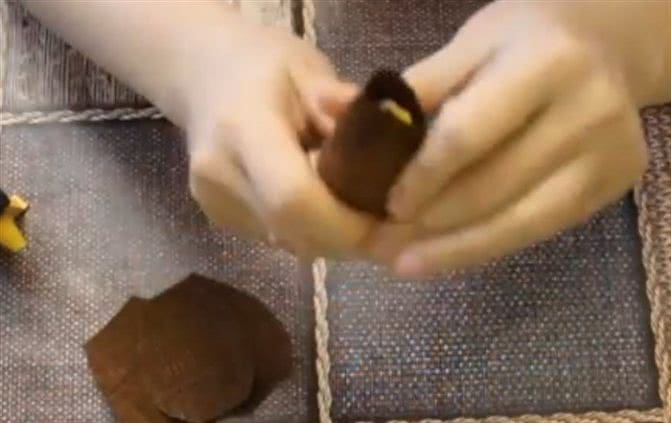 Оберните орехи и круглые конфетки бумагой, сформировав круг. Обклейте круг фунтиками из креп бумаги, приклейте к зубочистке. Оформите пространство вокруг бутылки.