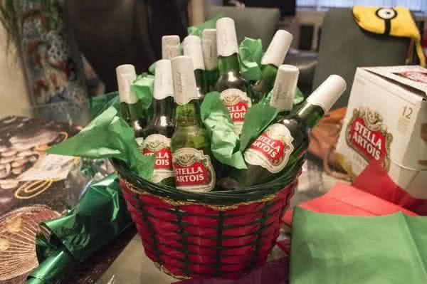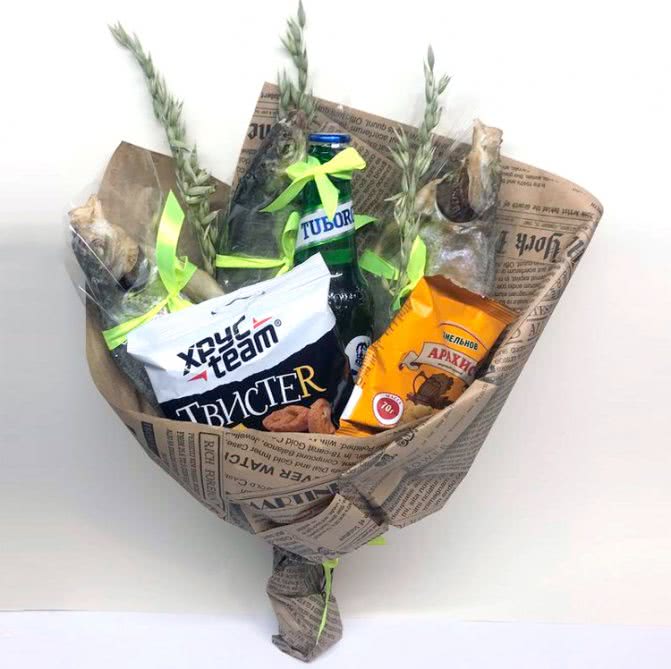В качестве подарка можно собрать и красиво оформить пиво со снеками, орешками и другими продуктами, служащими отличной закуской к любимому пенному напитку.